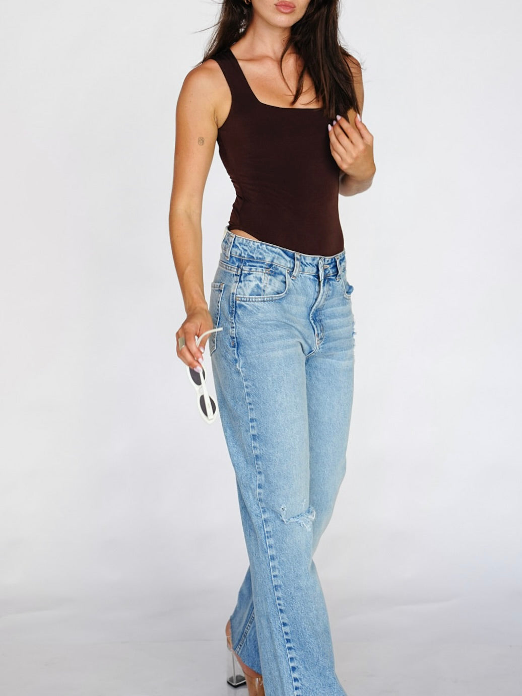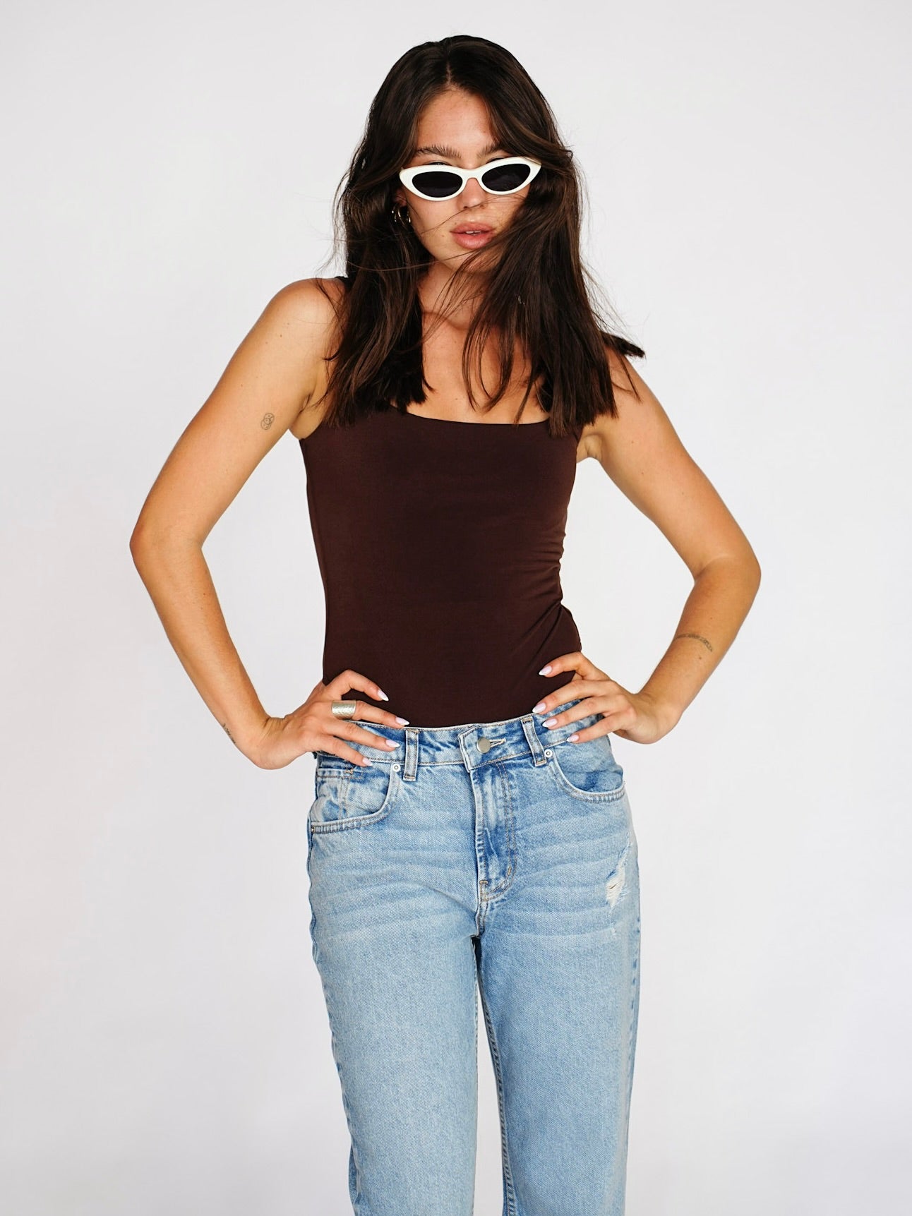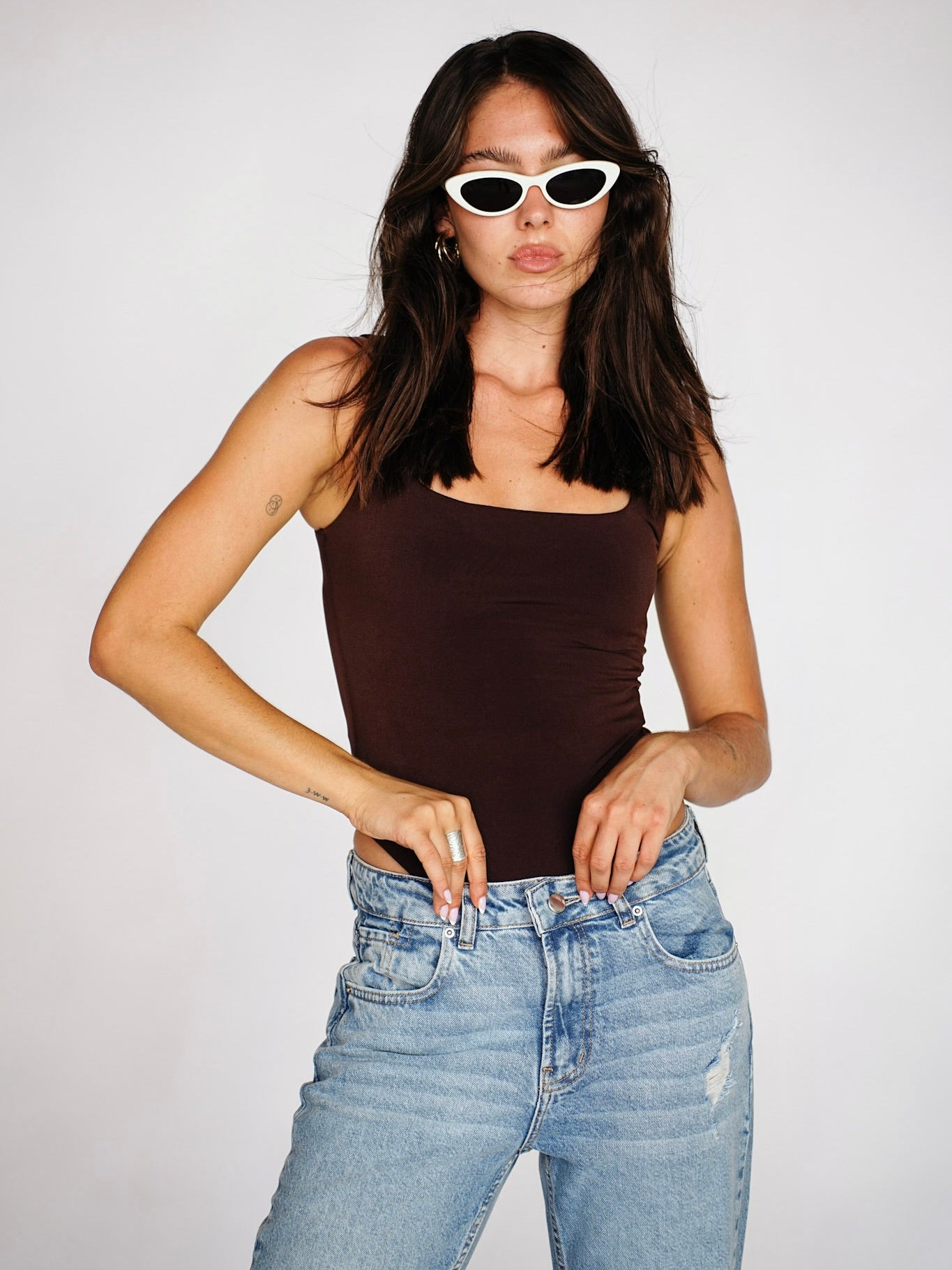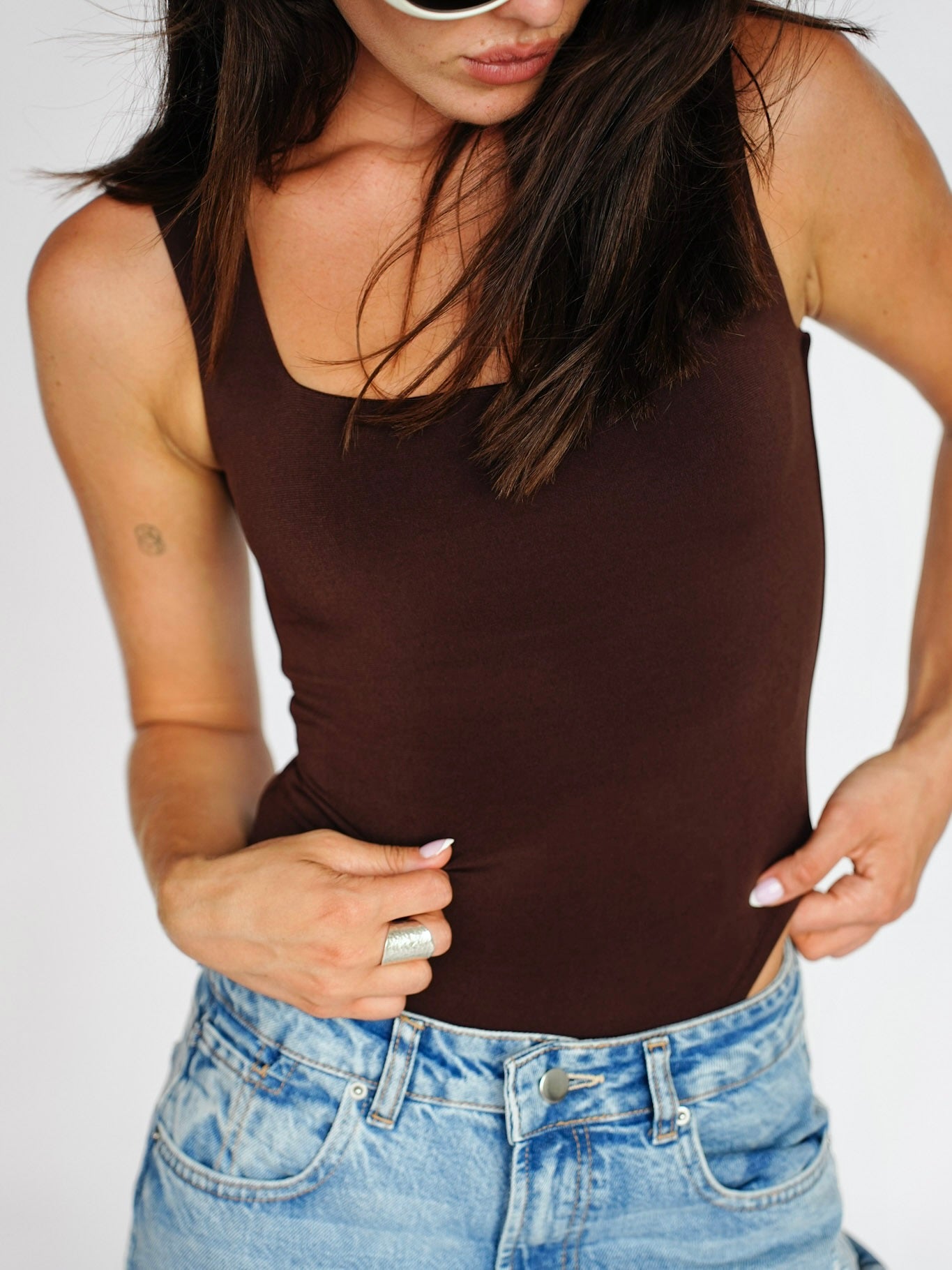 בגד גוף מבד לייקרה נמתח עם מפתח מרובע וכתפיות עבות