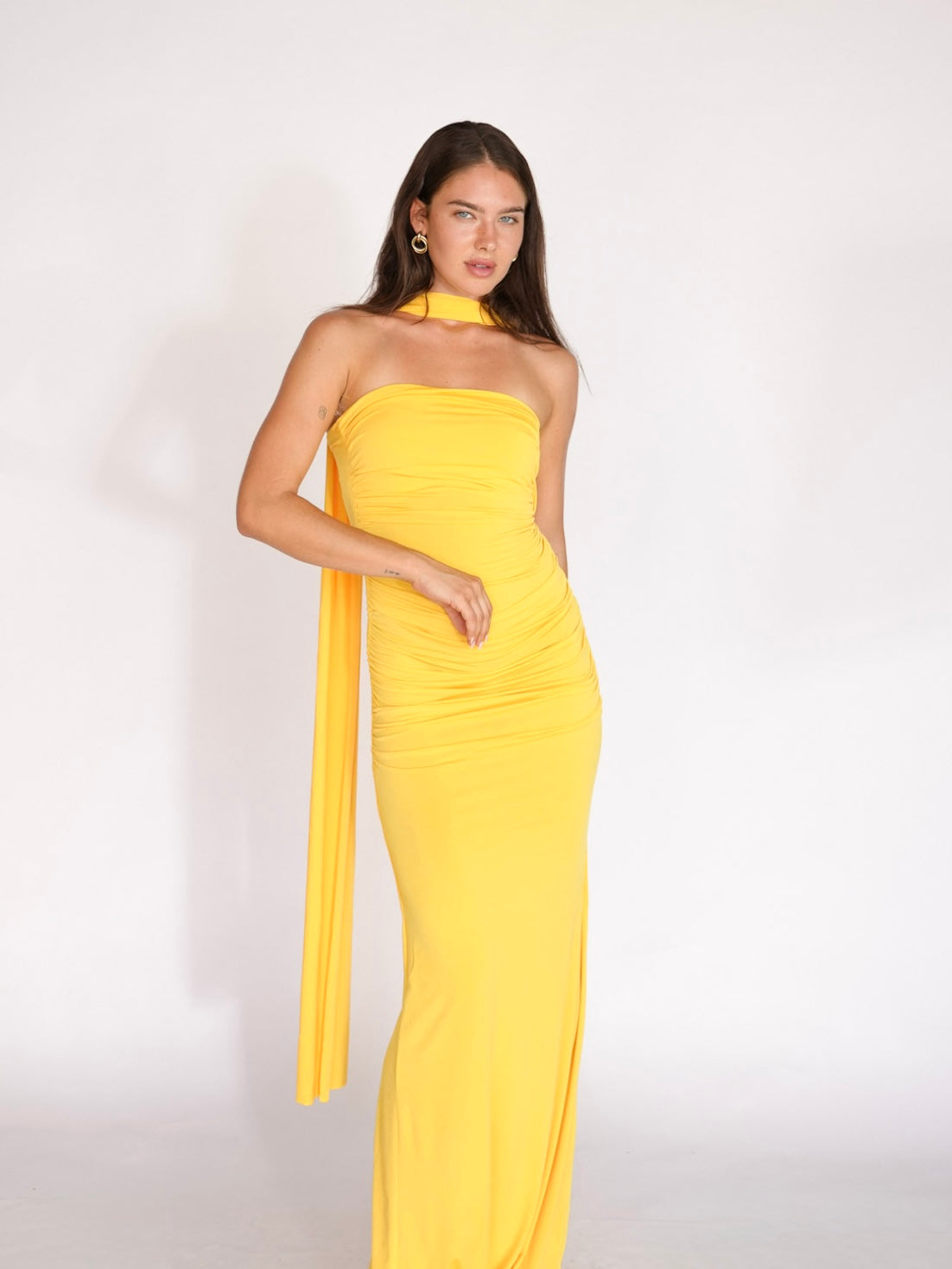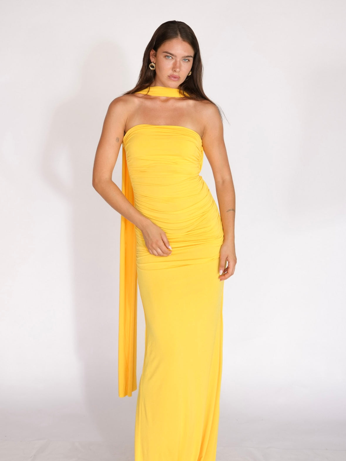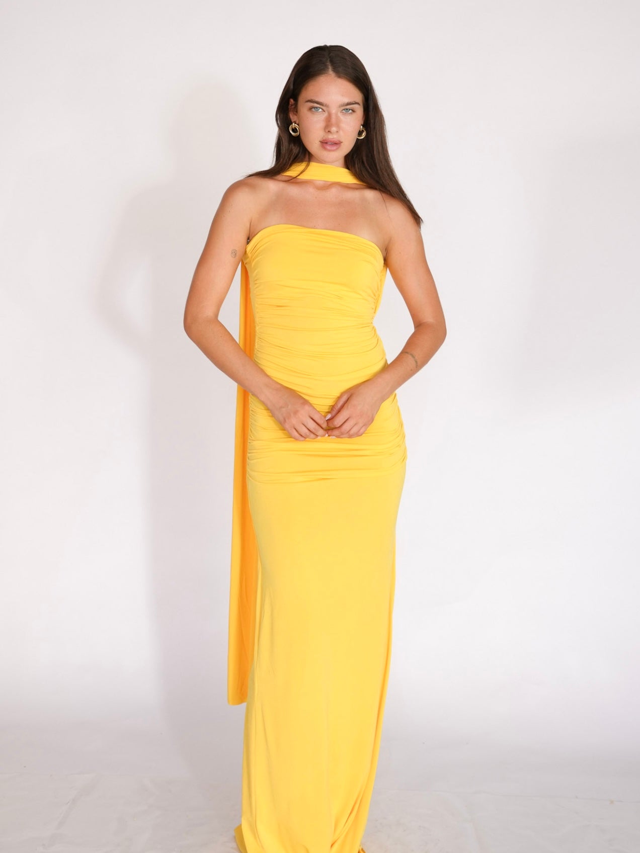 כיווצים בצידי השמלה ובד מחובר מאחור הניתן לליפוף סביב הצוואר