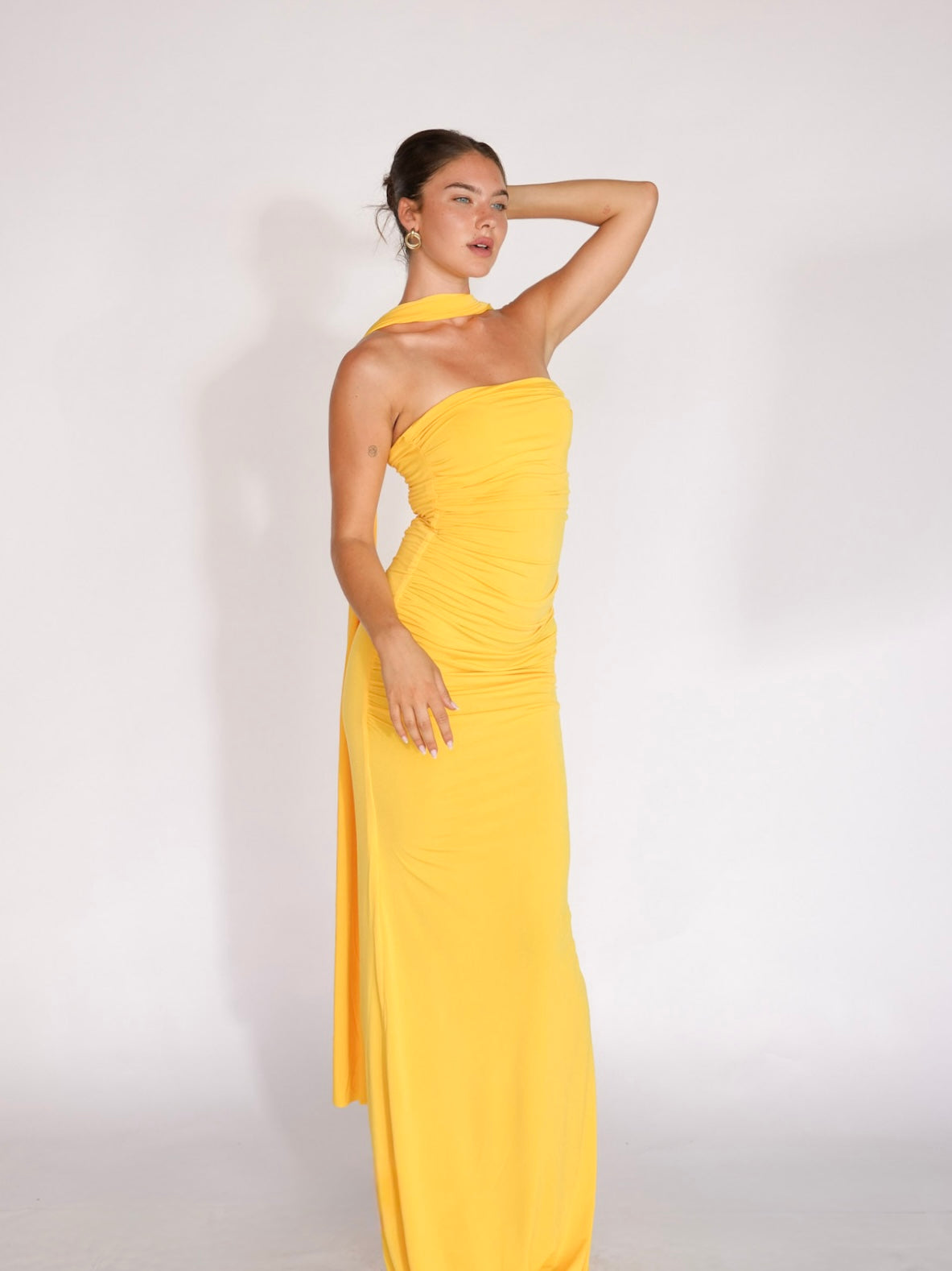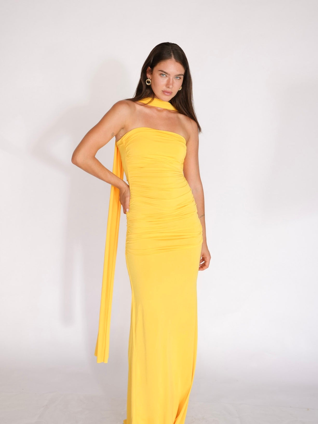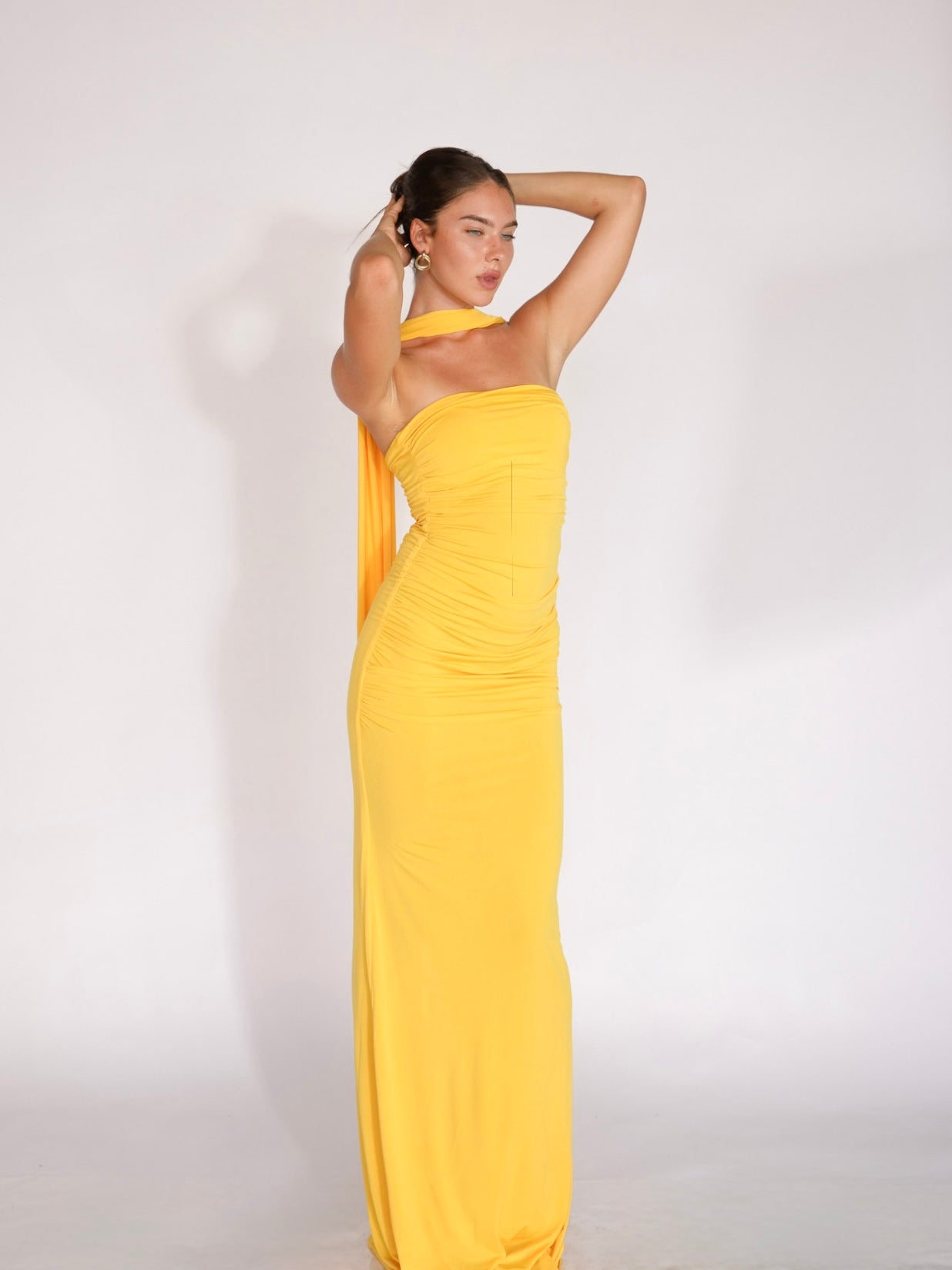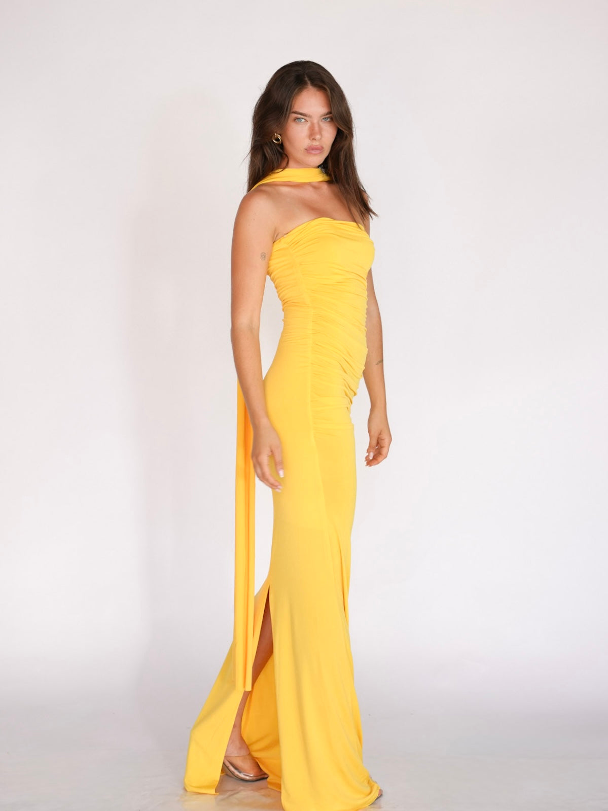 כיווצים בצידי השמלה ובד מחובר מאחור הניתן לליפוף סביב הצוואר